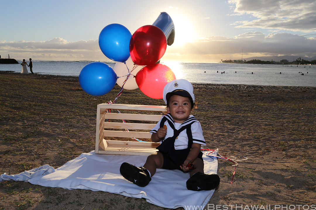 First Birthdays are a big deal in Hawaii. This 1st Birthday photoshoot took place at Ala Moana beach park next to Magic Island during sunset. The lucky family came prepared with their Birthday props and outfits for the lucky baby. It was a beautiful, calm sunset and the baby didn’t cry. Parents helped too when they could to make the baby smile and look towards the camera ensuring a successful 1st Birthday photo session. These Birthday photos were taken ahead of the actual 1st Birthday party to serve as invitations, collages, and unforgettable memories.